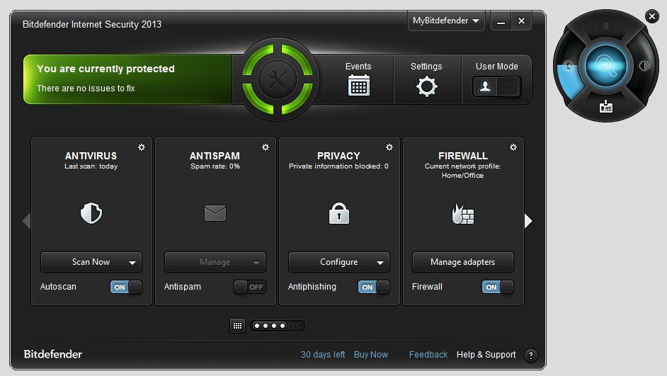 Bitdefender Internet Security 2013 сочетает все необходимые функции для защиты вашего компа и важной инфы, комфортного управления антивирусом и компонентами. Многоуровневая система защиты от вирусов и онлайн-угроз обеспечивается пасмурными антивирусными технологиями, активным мониторингом за поведением каждой из запущенных программ, двухсторонним фаерволом, антиспамом и сканером уязвимостей.