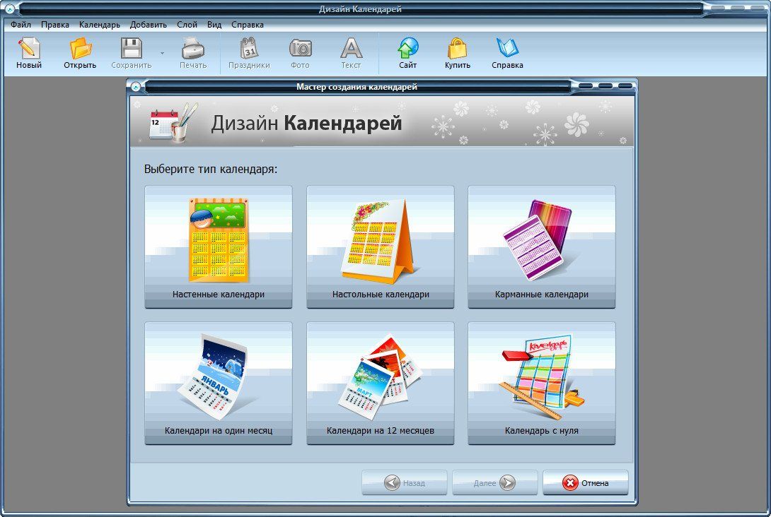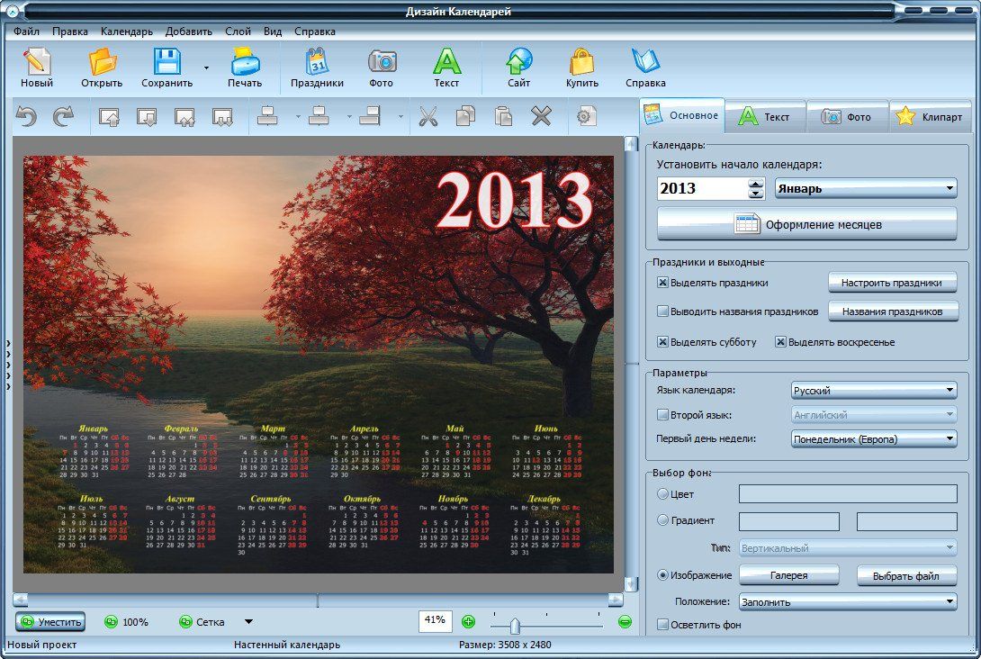 • Любые виды календарей! Вы сможете создавать самые различные календари: карманные, стенные, настольные; на целый год, квартал или на один месяц. Выбирайте хоть какой формат листа, композицию и стиль оформления. Поддерживаются многостраничные календари. • Сотни готовых шаблонов Создавайте прекрасные календари всего за несколько кликов мышью. Богатая коллекция шаблонов дизайна включает множество стилей и вариантов оформления календарей. Редактируйте готовые шаблоны или сделайте свой уникальный дизайн! • Индивидуальный календарь Программка "Дизайн Календарей" позволяет изготовить действительно неповторимый календарь: добавляйте хоть какое число фото, а также надписи и клипарт. Доступна вставка фото в всякую ячейку календарной сетки! • Настройка праздничков Вы можете с лёгкостью добавлять и редактировать праздничные дни. Каждый праздник можно выделить особенным цветом. Поддерживается работа с группами праздничков: муниципальные, религиозные, проф и т. п. • Стремительная печать календарей Программка для создания календарей позволяет распечатывать календари на бумаге самых разных форматов. Поддерживаются любые струйные и лазерные принтеры, а также профессиональное полиграфическое оборудование. • Маркетинговые календари Программка позволяет изготовить рекламный календарь высочайшего свойства практически за несколько минут! Вы можете добавить ваш логотип или всякую другую графику, а также разместить контактную информацию, описание товаров и услуг. • Поддержка любых языков Возможно создание календарей на российском, английском, германском, французском и почти всех остальных языках, а также добавление новейших языков. Доступно изготовка календарей с заголовками месяцев на двух языках сразу. • Просто и доступно каждому! Благодаря комфортному интерфейсу на российском языке вы сможете стремительно освоить все способности программы. Дизайн Календарей не просит познаний графического дизайна и полиграфии. Создавайте календари с наслаждением!