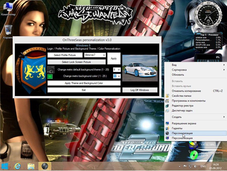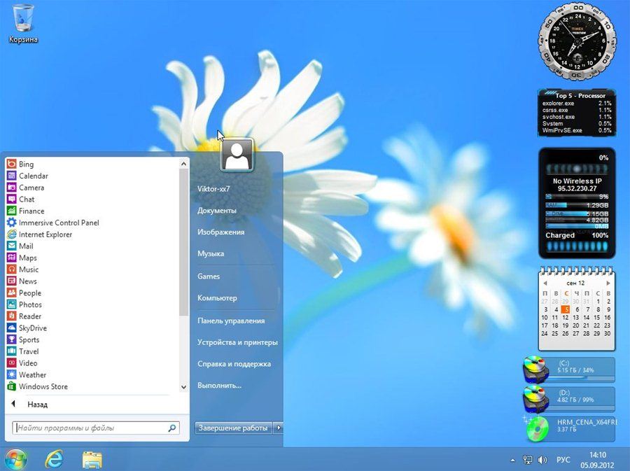 Также убрана надпись в правой части экрана. Добавлены твики на правой клавиши мыши и доборная функция "персонализация", с помощью которой можно поменять стиль метро, системы, установить для себя аватар. Добавлены гаджеты и клавиша "Пуск", установлена элегантная иконка для вида главных папок (удалить можно лишь через реестр).
